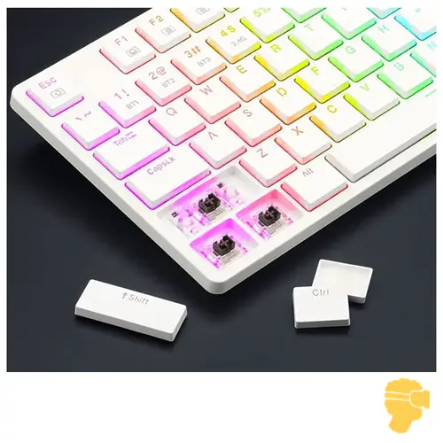 کیبورد فول سایز با با ۱۰۴ کلید و سوئیچ های مکانیکی آبی با قابلیت ضد گرد و غبار است . سوئیچ خطی کلیکی با مقاومت متوسط و صدایی واضح و لمسی دقیق ، حس خوبی برای تایپ و یا بازی ارائه میدهد و تجربه کاربر را در همه زمینهها به سطح دیگری ارتقا میبخشد.