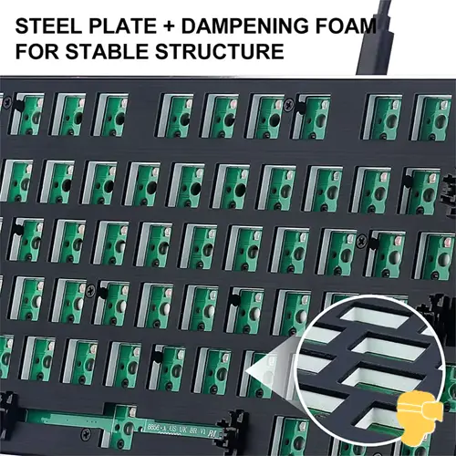 صفحه کلید barebones به شما امکان می دهد که سبک مورد علاقه خود را سفارشی کنید و به شما امکان می دهد به راحتی سوییچ ها و کلید ها را جا به جا و تعویض نمایید. این کیت بسیار کاربردی و مناسب هم برای گیمرها و هم برای کاربران عادی است . بدنه آلومینیومی و صفحه فولادی با فوم های رطوبت گیر باعث تایپ محکم و کم صدا همراه با انواع جلوه های نورپردازی RGB می شود . PCB از ویژگی hot-swappable پشتیبانی می کند، بنابراین شما نیازی به لحیم کردن سوئیچ به PCB ندارید. شما فقط باید سوئیچ هایی مانند Outemu، Kaih، TTC، Huano، Gateron و keycaps را نصب کنید و صفحه کلید سفارشی شما آماده خواهد شد.