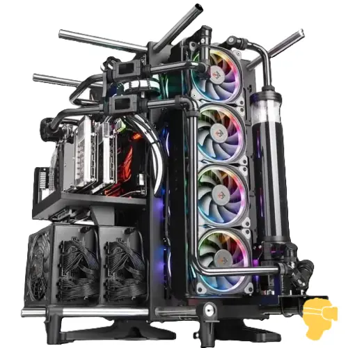 اولین چیزی که چشم را خیره میکند، طراحی چشمنواز و آیندهنگرانهی این کیس است. استفاده از کیس Thermaltake Core P90 با پنلهای شیشهای حرارتدیده و طراحی زاویهدار، ظاهری صنعتی و در عین حال لوکس به این سیستم بخشیده است. سیستم باز و ماژولار این کیس باعث شده تمام قطعات بهوضوح در معرض دید باشند و جلوهی نورپردازی RGB به طرز چشمگیری خودنمایی کند.